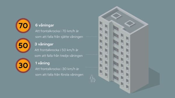 Redan vid låga hastigheter blir kraften stor vid en eventuell krock. Utan bälte klarar en vuxen person i bästa fall en krock i ungefär 7 km/tim förutsatt att hen är förberedd och kan hålla emot. Den förmå-gan och kraften har inte barn. Det kroppen utsätts för vid en krock i 50 km/tim motsvarar ett fall från tredje våningen.