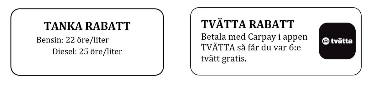 Teckna ett Carpay-/Volvo-/Renaultkort så får du extra drivmedelsrabatt på Tanka och rabatt på Bildepåns bilspa. Du ansöker enkelt om ett kort via appen Carpay alternativt volvofinans.se. Uppge kampanjkoden 1636 för att ta del av erbjudandet. Med ett Carpay-/Volvo-/Renaultkort har du tillgång till flera erbjudanden.